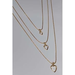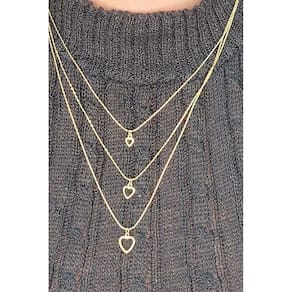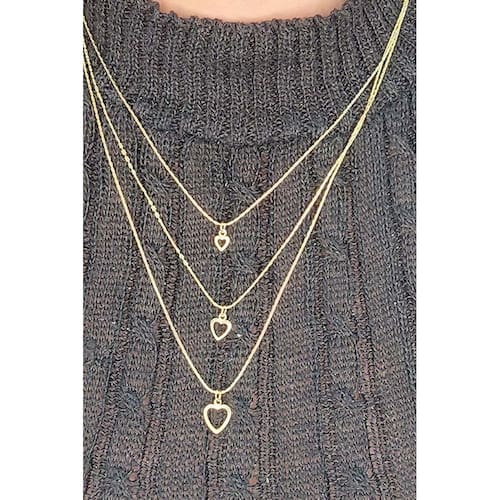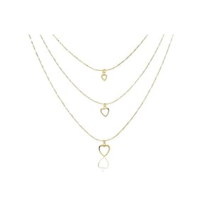 Este colar triplo é uma expressão de amor e romance, apresentando três corações vazados banhados em ouro 18k. O design delicado e feminino adiciona um toque de elegância ao seu visual, enquanto os corações transmitem sentimentos de afeto e carinho. Perfeito para uso diário ou para presentear alguém especial com uma peça cheia de significado.