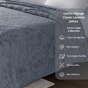 Descubra o prazer de vestir sua cama com a elegância e qualidade da coleção Vintage Classic da Jolitex. Com a tecnologia Chenille e uma paleta de cores sofisticada em bege, branco, cinza, marrom, verde e azul, cada peça traz um toque refinado para a sua decoração. Desenvolvida para ser prática e duradoura, não amassa, não encolhe e mantém sua beleza impecável, mesmo após muitas lavagens.