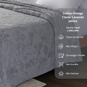 Descubra o prazer de vestir sua cama com a elegância e qualidade da coleção Vintage Classic da Jolitex. Com a tecnologia Chenille e uma paleta de cores sofisticada em bege, branco, cinza, marrom, verde e azul, cada peça traz um toque refinado para a sua decoração. Desenvolvida para ser prática e duradoura, não amassa, não encolhe e mantém sua beleza impecável, mesmo após muitas lavagens.