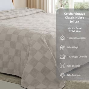 Descubra o prazer de vestir sua cama com a elegância e qualidade da coleção Vintage Classic da Jolitex. Com a tecnologia Chenille e uma paleta de cores sofisticada em bege, branco, cinza, marrom, verde e azul, cada peça traz um toque refinado para a sua decoração. Desenvolvida para ser prática e duradoura, não amassa, não encolhe e mantém sua beleza impecável, mesmo após muitas lavagens.