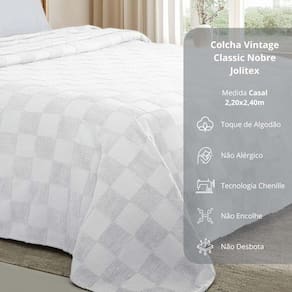 Descubra o prazer de vestir sua cama com a elegância e qualidade da coleção Vintage Classic da Jolitex. Com a tecnologia Chenille e uma paleta de cores sofisticada em bege, branco, cinza, marrom, verde e azul, cada peça traz um toque refinado para a sua decoração. Desenvolvida para ser prática e duradoura, não amassa, não encolhe e mantém sua beleza impecável, mesmo após muitas lavagens.