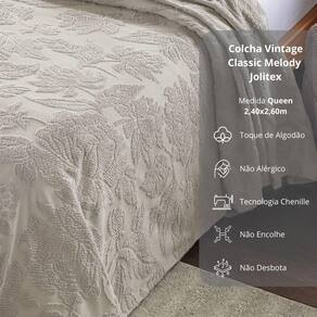Descubra o prazer de vestir sua cama com a elegância e qualidade da coleção Vintage Classic da Jolitex. Com a tecnologia Chenille e uma paleta de cores sofisticada em bege, branco, cinza, marrom, verde e azul, cada peça traz um toque refinado para a sua decoração. Desenvolvida para ser prática e duradoura, não amassa, não encolhe e mantém sua beleza impecável, mesmo após muitas lavagens.