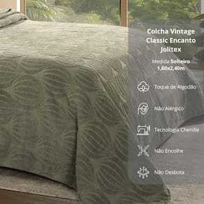 Descubra o prazer de vestir sua cama com a elegância e qualidade da coleção Vintage Classic da Jolitex. Com a tecnologia Chenille e uma paleta de cores sofisticada em bege, branco, cinza, marrom, verde e azul, cada peça traz um toque refinado para a sua decoração. Desenvolvida para ser prática e duradoura, não amassa, não encolhe e mantém sua beleza impecável, mesmo após muitas lavagens.