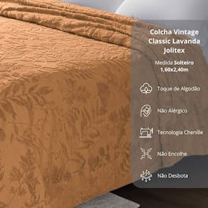 Descubra o prazer de vestir sua cama com a elegância e qualidade da coleção Vintage Classic da Jolitex. Com a tecnologia Chenille e uma paleta de cores sofisticada em bege, branco, cinza, marrom, verde e azul, cada peça traz um toque refinado para a sua decoração. Desenvolvida para ser prática e duradoura, não amassa, não encolhe e mantém sua beleza impecável, mesmo após muitas lavagens.