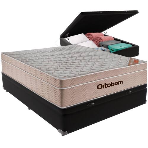 Bem-vindo(a) ao nosso catálogo! Apresentamos a você uma descrição completa sobre esse produto:\nO AirTech SpringMolas Ensacadas é um colchão de molas ensacadas que oferece uma excelente adaptação ao corpo, proporcionando um sono confortável e revitalizante. Com sua espuma D26 Pró, o colchão oferece suporte ideal e durabilidade a longo prazo. O Pillow Euro proporciona uma sensação de maciez e aconchego, enquanto a lateral em suede dá um toque de elegância ao produto.\nColchão: Modelo: Airtech Molas ensacadas; Marca: Ortobom; Tamanho: Viúvo; Dimensões: 128x188x25cm; (largura x comprimento x altura) Conforto: Molas Ensacadas, Espuma D26 Pró, Pillow Euro; Proteções: Antiácaro, antialérgico, antifungo, antimofo; Possui: Lateral em Suede; Peso máximo recomendado: até 120Kg (por pessoa); Garantia: 03 meses;\nSuporte e Altura: Este colchão suporta até 120kg, tornando-o ideal para pessoas de todos os tamanhos e formas. Com uma altura de 25cm, o AirTech SpringMolas Ensacadas oferece uma sensação de conforto e segurança, permitindo que você descanse profundamente e acorde revigorado pela manhã.\nQualidade Ortobom: O AirTech SpringMolas Ensacadas é produzido pela renomada marca Ortobom, conhecida por sua expertise em tecnologia do sono. Com anos de experiência no mercado, a Ortobom é reconhecida por oferecer produtos inovadores e de alta qualidade, que atendem às necessidades dos clientes mais exigentes.\nBase Box com Baú: Marca: KazaMix; Cor do Baú: Preto; Revestimento da Cama: Material Sintético; Material dos pés: Madeira; Estrutura: Madeira; Abertura: Pistão a gás; Peso máximo recomendado: até 150kg de cada lado; Altura do Baú: 32cm; Altura dos pés: 5cm; Altura total: 37cm; Garantia: 03 meses; Selo Ecologicamente Correto.\nInvista no seu sono e experimente o conforto e a qualidade!\nAtenção: Antes de finalizar sua compra, certifique-se de que as dimensões do produto sejam adequadas para serem transportadas pelos elevadores, portas, escadas e corredores de sua residência. Ressaltamos que não nos responsabilizamos pelo transporte do produto por meios específicos, como escadas, guinchos ou içamentos.
