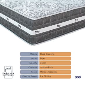 O conforto que sua casa precisa e a qualidade que você merece está na Kazamix!Conheça o colchão Black Graphite da Anjos, a solução perfeita para um sono confortável e revitalizante. Com tecido em malha, ele proporciona maior liberdade de movimentos e uma sensação de frescor e conforto durante toda a noite. As Molas Ensacadas oferecem um suporte ideal para cada parte do corpo, adaptando-se ao seu formato e garantindo um descanso tranquilo.Com conforto intermediário, o Black Graphite é a escolha ideal para quem busca o equilíbrio entre firmeza e suavidade. Além disso, o colchão é tratado com proteção antiácaro e antialérgico, promovendo um ambiente de sono mais saudável.Invista no seu bem-estar e experimente a qualidade do colchão Black Graphite.Modelo: Black Graphite 32Marca: AnjosTamanho: QueenDimensões: 158x198X32 (Largura x Comprimento x Altura)Conforto: IntermediárioSistema: Molas EnsacadasPillow: Não se AplicaPeso Máximo recomendado: 120 kg (Por pessoa)Proteções: Antiácaro, antialérgico, antifungo, antimofoGarantia: 1 ano pelo fabricante