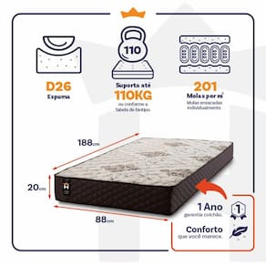 Medidas do Colchão: 88x188x28 cm, 96X203x28 cm,138x188x28 cm, 158x198x28 cm, 193x203x28 cm.