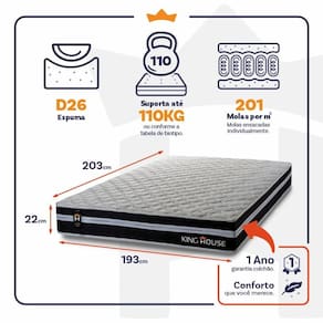 Feito com os mais nobres materiais em sua composição, ele conta com espuma D26. O colchão King House acomoda melhor o contorno do corpo, dispondo de forma correta quadris e ombros, expulsando as dores e problemas de coluna.
