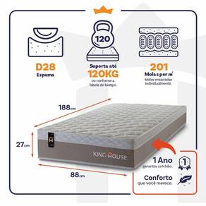 Feito com os mais nobres materiais em sua composição, ele conta com espuma D28. O colchão King House acomoda melhor o contorno do corpo, dispondo de forma correta quadris e ombros, expulsando as dores e problemas de coluna.