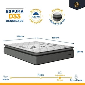 Nós não nos responsabilizamos pela montagem e por problemas causados pela montagem realizada por você ou montador contratado. Tamanho: Cinza | Material: Espuma D33 | Acabamento: Revestimento malha e poliéster | Garantia: 3 meses | Altura (cm): 29 | Largura (cm): 138 | Profundidade (cm): 188 | Tipo do Colchão: Casal | Tamanho do Colchão: 1,38 x 1,88 | Tipo de Mola: Sim | : Sim | : Sim | : Sim | Nível de Conforto: Firme | Possui Pillow: Sim | Modelo: Resistence | Quantidade de Caixa de embalagem: 2 | Densidade: D33 | Necessita Montagem: Não | È colchão na caixa: Não