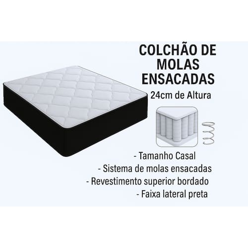 - Proteções: Antiácaro - Antialérgico - Antifungo - Antimofo;- Acabamento: Bordado em Matelassê;- Matéria prima: Poliéster/Bordado;- Mola: Ensacada;- Peso máximo recomendado: até 100kg (por pessoa)