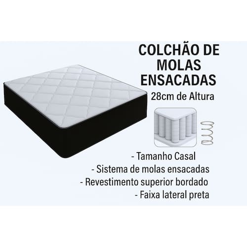 - Proteções: Antiácaro - Antialérgico - Antifungo - Antimofo;- Acabamento: Bordado em Matelassê;- Matéria prima: Poliéster/Bordado;- Mola: Ensacada;- Peso máximo recomendado: até 100kg (por pessoa) - Garantia: 3 meses;- Dimensões do produto (altura x largura x comprimento): 28x138x188cm;