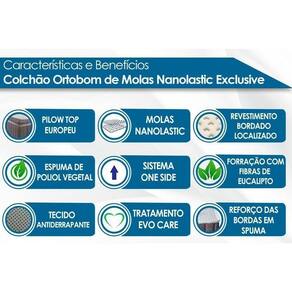 BENEFÍCIOS EXTERNOS DO COLCHÃO Tipo de Pillow - Pillow Top Europeu Tipo de Bordado do Tecido de Revestimento - Localizado Tipo Tecido de Forração Revestimento - Fibras de Eucalipto Tipo de Tecido de Revestimento da Faixa Lateral - Poliéster Tecido com Tratamento - Evo Care - AntiÁcaro e AntiFungo Modo de Utilização - One Side Tipo de Forração do Revestimento Inferior - Antiderrapante
