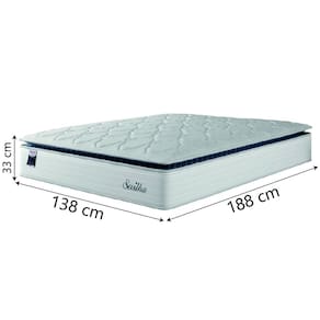 MEDIDAS: A = 33 cm L = 138 cm P = 188 cm PESO: 33,2 Kg PESO SUPORTADO: 150 kg Por Pessoa MODELO: Colchão Casal Molas Ensacadas Sevilha Com Pillow 138x188x33cm Suporta Até 150 kg Por Pessoa MARCA: Hellen COR: Branco/Cinza REVESTIMENTO SUPERIOR: Tecido Jacquard branco e Espuma D20 (Matelassê) REVESTIMENTO LATERAL: Tecido Jacquard branco e Espuma D20 (Matelassê) REVESTIMENTO INTERNO: Molas ensacadas aliada com espuma D28, permitindo que o colchão suporte até 150 kg por pessoa PILLOW: Sim, oferecendo mais sensação de conforto ITENS INCLUSOS: 1 Colchão de 1,38m INSTRUÇÕES E CUIDADOS: Utilizar em local seco com passagem de ar, não dobrar, fazer giro quinzenalmente no sentido pés/cabeceira GARANTIA: 12 Meses pelo Fabricante
