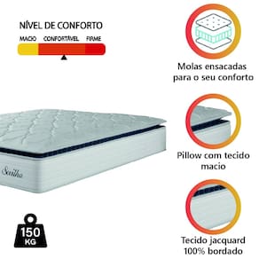 Descubra o conforto do Colchão de Casal Sevilha, projetado para elevar a qualidade do seu sono proporcionando uma experiência única de descanso! Conta com molas ensacadas de alta qualidade que trabalham em conjunto proporcionando resistência e aconchego na hora do sono, pillow com tecido toque macio, e suporta até 150 kg por pessoa. Invista na qualidade do seu sono e experimente garantia total de descanso e qualidade de vida!