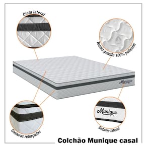 Produzido com molas ensacadas individualmente, garantindo estabilidade e um descanso muito mais confortável. O revestimento superior é em tecido poliéster cinza com tratamento Aloe Vera e matelassê com espuma D20 de 2 cm. Já o revestimento inferior é confeccionado em tecido poliéster antiderrapante, que proporciona maior segurança, enquanto o revestimento lateral em tecido granite branco com matelassê em espuma D20 oferece resistência e acabamento sofisticado. Para maior conforto e durabilidade, o colchão conta com espuma interna D26, bordas em poliestireno expandido para firmeza adicional e suporte de peso de até 110 kg por pessoa. O Colchão Munique Special é a escolha perfeita para você que busca qualidade, conforto e noites de sono verdadeiramente revigorantes.