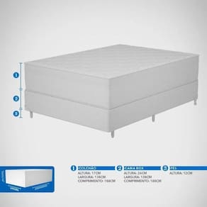 -Modelo: Guarda Costas In Box -Tamanho: Casal (138 x 188 x 17 cm) -Nível de Firmeza: Intermediário -Peso Suportado: até 100 kg por pessoa -Tecido do Tampo: Malha branca 170 g/m² -Garantia: 12 meses (molas e espuma) / 3 meses (tecido)