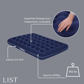 - Composição: 59,3% PVC, 39,8% fibra viscosa + PVC, 0,9% outros materiais, garantindo durabilidade e resistência. - Medidas Inflado: Largura: 1,52 m Comprimento: 2,03 m Altura: 22 cm - espaço ideal para um casal em cada colchão. - Capacidade de Carga: Suporta até 300 kg 661 lbs por colchão, perfeito para diversas ocasiões. - Superfície Flocada: Acabamento aveludado para maior conforto e sensação de maciez. - Inferior em Vinil: Resistente e durável, ideal para uso em diferentes superfícies. - Vigas Internas: Proporcionam estabilidade e suporte durante o uso. - Câmara de Ar Adaptável: Ajuste facilmente a firmeza do colchão conforme sua preferência. - Incluso: 2 colchões e 2 adesivos de reparo para pequenos consertos.