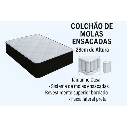 - Proteções: Antiácaro - Antialérgico - Antifungo - Antimofo;- Acabamento: Bordado em Matelassê;- Matéria prima: Poliéster/Bordado;- Mola: Ensacada;- Peso máximo recomendado: até 100kg (por pessoa);- Garantia: 3 meses;- Dimensões do produto (altura x largura x comprimento): 28x138x188cm;