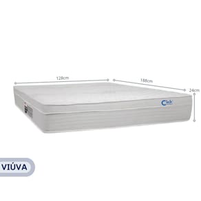 - Largura: 128 cm - Comprimento: 188 cm - Altura: 24 - Biotipo: 110kg (por pessoa) - Estrutura interna: Armação com Tecnologia Suíça: - As molas marca (TECNOPEDIC) – Molas feitas em aço de 2,20 mm / Bordas perimetrais em espuma resistente. / Revestida por Feltro em toda sua armação, proporcionandouma maior estabilidade do colchão. - Enchimento Interno: 1 Lamina D20 / Lamina de Espuma D26 / AG no Enchimento - Revestimento: Malha - Nível de Conforto: Intermediário - Pillow Top: Euro One Face - Garantia do Fabricante: 12 Meses no Molejo - 90 dias no Tecido