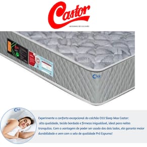 A linha Sleep Max , da Castor, é ideal para quem gosta de um colchão Firme e de Espumas, pois possui espuma desenvolvida com matéria prima importada de 1ª linha. Estabilidade e conforto definem, além do design exclusivo e inovador.