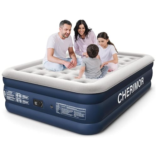 A solução de sono confortável de Cloreto de Polivinila. O colchão de ar queen da CHERIMOR de 203x152x48cm apresenta uma superfície superior feita de material aveludado macio e seguro para crianças. Além de agradável ao toque e respirável, é fácil de limpar, adequado para todos os tipos de dorminhocos. Com 40 câmaras, suporta até 362 kg, oferecendo conforto comparável aos colchões de molas de alta qualidade. Feito de PVC antipuncionamento 40% mais espesso, com processo de prensagem a quente de três camadas, possui fundo antiderrapante e silencioso.