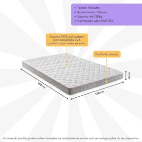 Imagem meramente ilustrativa. A estampa pode sofrer variações conforme o lote do produto. Acabamento: Debrum | Tecido: Poliéster | Tipo de Enchimento: Espuma Poliuretano | Referência do Modelo: CR451C | Linha: Inducol | Tonalidade: Cinza | Altura Montado: 14 | Largura Montado: 138 | Profundidade Montado: 188 | Tamanho (L x A x P): 138 x 14 x 188 | Conforto: Macio | Com Pillow: Não | Tipo de Pilow: N/A | É Duplo Pillow: Não | Densidade: D23 | Peso Máximo Suportado: 120 kg | Capacidade: Até 60 kg por pessoa | Instruções de Cuidado: Limpeza a seco e aspiração de pó. Indicamos o giro a cada 15 dias. | Necessita de Montagem: Não | É antiácaros: Não | É hipoalergênico: Não | É eco-friendly: Sim | Classificação do Colchão: Casal | Tipo do Colchão: Padrão | Estrutura do Colchão: Espuma | Peso do Produto: 9 | Produto: Colchão | Garantia do Fabricante: 12 | Conteúdo da Embalagem: 1 colchão e manual. | Tamanho: Casal | É infantil: Não | Fabricante: Inducol | Altura (cm): 14 cm | Largura (cm): 138 cm | Comnto (cm): 188 cm | Estado de Origem: RS | Produto precisa de Montagem?: Não | É colchão na caixa: Não | Altura do Produto com Embalagem: 14 | Largura do Produto com Embalagem: 138 | Comnto do Produto com Embalagem: 188 | Peso do Produto com Embalagem: 9 | Nome do Produto no Fornecedor: Colchão de Casal com Espuma D23 138x188cm Inducol CR451C Cinza | Descrição do Tamanho: (L x A x P): 138 x 14 x 188 cm | Tempo de Garantia: 12 meses | Destaque 1: Tamanho do colchão (L x A x P): 138 x 14 x 188 cm | Destaque 2: Suporta até 60 kg por pessoa. | Destaque 3: Revestimento em Poliéster. | Destaque 4: Enchimento de Espuma Poliuretano: conforto e qualidade nas suas noites de sono. | Destaque 5: Nível de Conforto: Macio | Registro INMETRO: 09978-05/2024 | FloorToTop (cm): 14 Centimetros | SideToSide (cm): 138 Centimetros | HeadToToe (cm): 188 Centimetros | Sistema de molas: N/A | Quantidade de caixas de embalagem: 01 | É embalado a vácuo: Não | É ortopédico: Não | Com EPS: Não Cor: Cinza