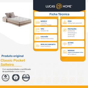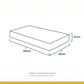**IMPORTANTE: IMAGENS MERAMENTE ILUSTRATIVAS. (A LUCAS HOME não trabalha com móveis planejados. Podendo haver pequenas variações nas medidas e cores do produto). **A LUCAS HOME não disponibiliza no momento o serviço de montagem, sendo de total responsabilidade do comprador. A LUCAS HOME Recomenda que a montagem seja feita por um profissional da área.**ATENÇÃO: Verifique se as dimensões dos produtos passam por elevadores, portas, escadas e corredores. A LUCAS HOME Não se responsabiliza pelo transporte dos produtos por escadas, guinchos, içamentos ou quaisquer outros meios específicos de transporte. Especificações Técnicas Colchão: - Tipo de Mola: Ensacada; - Proteções: Antiácaro - Antialérgico - Antifungo - Antimofo; - Acabamento: Bordado em Matelassê; - Matéria prima: Espuma/Molas/Tecido; - Tipo de conforto: Macio; - Peso máximo recomendado: até 120kg (por pessoa); - Garantia: 12 meses; - Dimensões do produto (largura x comprimento x altura) 88x188x22cm;