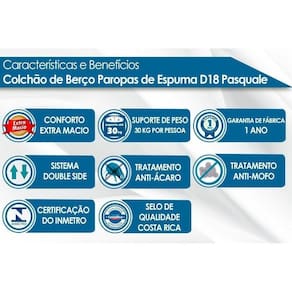 BENEFÍCIOS GERAIS DO COLCHÃO Certificados de Qualidade - Qualidade Aprovada - INMETRO - INMETRO Vantagens Extras do colchão de berço - Ecologicamente Correto - Manta Antirrefluxo Nossa Avaliação - Qualidade Muito Boa Tempo de Garantia - 12 meses