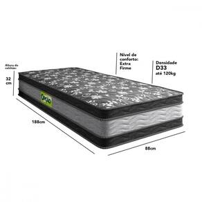 Características: - Tecido tampo e lateral em poliéster - Revestimento em poliéster - Densidade D33 - Possuí EPS - Semi ortopédico - Pode ser utilizado dos dois lados - Não tem pillow - Acabamento bordado - Nível de conforto firme - Possuí tratamento Antiácaro Antialérgico - Suporte de peso 110 kg - Código EAN: 7898637216436 - Garantia de 1 ano