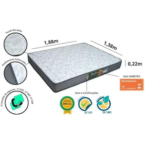 Certificado pelo Inmetro é produzido de acordo com as Normas da Associação Brasileira de Normas Técnicas (ABNT). A Becflex é certificada pela ISO 9001, certificação que garante a qualidade e padronização dos colchões, ISO 14001, que certifica a responsabilidade ambiental do processo produtivo, possui direito ao uso do SELO ABICOL (ASSOCIAÇÃO BRASILEIRA DA INDÚSTRIA DE COLCHÕES), comprovando a sua idoneidade. Também é uma empresa AMIGA DA CRIANÇA, associada à FUNDAÇÃO ABRINQ, e ainda possui o selo RECUPERA, o qual garante a reciclagem das embalagens dispostas no mercado, pela empresa. Obs: Este anúncio não acompanha a cama box, apenas o colchão.