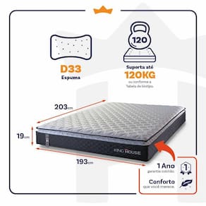Feito com os mais nobres materiais em sua composição, ele conta com espuma D33 . O colchão King House acomoda melhor o contorno do corpo, dispondo de forma correta quadris e ombros, expulsando as dores e problemas de coluna.