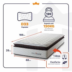 Feito com os mais nobres materiais em sua composição, ele conta com espuma D33 . O colchão King House acomoda melhor o contorno do corpo, dispondo de forma correta quadris e ombros, expulsando as dores e problemas de coluna.