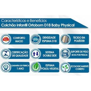 Imagens Meramente Ilustrativas. Não nos responsabilizamos pela montagem/instalação dos produtos. Todas as informações divulgadas são de responsabilidade exclusiva do fabricante/fornecedor. Tipo Tecido de Forração Revestimento: Poliéster | Nível de Firmeza do Colchão: Macio | Nossa Avaliação: Qualidade Excelente | Peso Máximo Suportado: 50 kg | Tempo de Garantia: Certificado de Garantia Digital | Vantagens Extras de Colchão: Ecologicamente Correto | Certificados de Qualidade: INMETRO | Modo de Utilização: Double Side | Densidade da Espuma: D18 | É kit: Não | Tipo de Espuma: Espuma de Poliol Vegetal | Material: Tecido | Fonte do produto: N/A | Condição do item: Novo | Classificação da Cama: Berço | Produto: N/A | Cômodo Indicado: Multiuso | Código universal de produto (GTIN): 7896988328464 | Produto precisa de Montagem?: Sim, a montagem é simples mas sugerimos a contratação do nosso serviço de montagem (para os CEPs em que o serviço está disponível) ou de algum profissional experiente de sua preferência | Descrição do Tamanho: 10.00x:70.00x130.00 cm | Estado de Origem: RJ | País de origem: Nacional | Peso Produto Com Embalagem (Kg): 6.83 | Material para Filtro: N/I | Cor Mobly: N/I | Condição do Item: Novo | Link Site: https://www.costaricacolchoes.com.br/produtos.asp?produto=24471 | Numeral: 0 | Não se Aplica: N/A | Não Possui: Não | Linha/Modelo: Ortobom | Cor Cnova: Blush | Cor Meli: Ciano | Contatos Sac Fábrica: sacrj@ortobom.com.br | Categoria Trilha: Colchão> Colchão Infantil | Categoria - Sub: Colchão Infantil | Categoria - Pai: Colchão | Comprimento Embalagem: 130.00 | Largura Embalagem: 70.00 | Altura Embalagem: 10.00 | Peso: 6.83 Kg | Kit: 0 | Peso Real Kg: 6.83 | Peso Cubado: 22.75 | Volumes: 1 | M3: 0.09 | Comprimento/Profundidade: 130 cm | Largura: 70 cm | Altura: 10 cm | Tamanho Montado: Larg:70.00 x Comp/Prof:130.00 x Alt: 10.00 | Comprimento/Profundidade Montado: 130.00 | Largura Montado: 70.00 | Altura Montado: 10.00 | Tamanho Cama Colchão: Infantil | Data Cadastro: 2024-1-12 16:27:39 | Sigla Estoque: 1 | Marca: Ortobom