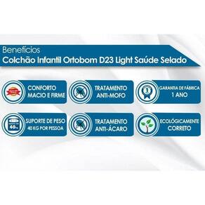 Imagens Meramente Ilustrativas. Não nos responsabilizamos pela montagem/instalação dos produtos. Todas as informações divulgadas são de responsabilidade exclusiva do fabricante/fornecedor. Tipo Tecido de Forração Revestimento: Liso de Alta Qualidade | Tipo de Estrutura do Bloco de Espuma: D23 | Tipo de Conforto: Macio c/ Firmeza | Nossa Avaliação: Qualidade Muito Boa | Peso Máximo Suportado: 40 kg | Tempo de Garantia: 12 meses | Vantagens Extras do colchão de berço: Ecologicamente Correto | Certificados de Qualidade: INMETRO | Tipo de Tecido de Revestimento da Faixa Lateral: Bordado | Tipo de Bordado do Tecido de Revestimento: Matelassê | Tecido com Tratamento: AntiÁcaro e AntiFungo | Modo de Utilização: Double Side | É kit: Não | Material: Tecido | Fonte do produto: N/A | Condição do item: Novo | Classificação da Cama: Infantil | Produto: N/A | Cômodo Indicado: Multiuso | Código universal de produto (GTIN): 7896988091443 | Condição do Item: Novo | Link Site: https://www.costaricacolchoes.com.br/produtos.asp?produto=3127 | Numeral: 0 | Não se Aplica: N/A | Não Possui: Não | Link Youtube: https://www.youtube.com/watch?v=Si-5cpmJ70E | ID Youtube: Si-5cpmJ70E | Linha/Modelo: Ortobom | Cor Cnova: Blush | Cor Meli: Ciano | Contatos Sac Fábrica: sacrj@ortobom.com.br | Categoria Trilha: Colchão> Colchão Infantil | Categoria - Sub: Colchão Infantil | Categoria - Pai: Colchão | Comprimento Embalagem: 130.00 | Largura Embalagem: 60.00 | Altura Embalagem: 12.00 | Kit: 0 | Peso: 5.62 Kg | Peso Real Kg: 5.62 | Peso Cubado: 23.40 | Volumes: 1 | M3: 0.09 | Comprimento/Profundidade: 130 cm | Largura: 60 cm | Altura: 12 cm | Tamanho Montado: Larg:60.00 x Comp/Prof:130.00 x Alt: 12.00 | Comprimento/Profundidade Montado: 130.00 | Largura Montado: 60.00 | Altura Montado: 12.00 | Tamanho Cama Colchão: Infantil | Data Cadastro: 2023-7-1 17:31:39 | Sigla Estoque: 2 | Marca: Ortobom