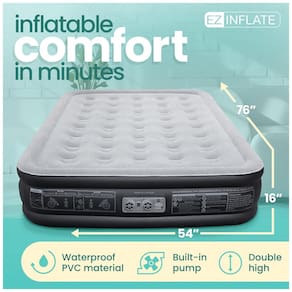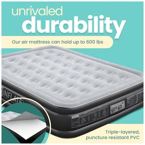 INFLAÇÃO RÁPIDA Veja como nosso colchão de ar de luxo com bomba embutida infla em 2 minutos ou menos Esteja você acampando ou tendo uma festa do pijama, esta cama inflável fará você cochilar em segundos. IMPERMEÁVEL Impermeável e resistente a perfurações, nosso colchão inflável completo é feito de PVC durável de camada tripla. Cada colchão de viagem ou acampamento pode suportar até 300 kg ALTO DUPLO Este colchão inflável de de altura dupla tem um top flocado premium ultramacio para estabilidade antiderrapante onde quer que você descanse a cabeça. A tecnologia de feixe de bobina fornece conforto e suporte de colchão real. CONFORTO PERSONALIZADO Personalize o volume de ar em seu colchão de ar de acampamento para se adequar ao seu sono. Um simples giro da válvula de inflar, desinflar transformará uma noite agitada em um sono relaxante Marca: Não Informado