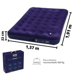 O Colchão Multiuso Casal Mor possui excelente qualidade. Ele é produzido em PVC resistente pré-testado, mais espesso em toda sua estrutura. Conta com revestimento aveludado na parte superior que torna sua superfície extremamente confortável e facilita a aderência do lençol ou dispensa sua utilização. Além disso, suas ondulações proporcionam o ajuste do corpo, oferecendo um descanso agradável e adequado para diversas situações. O Colchão Mor possui inflador acoplado com sistema de fole que facilita seu enchimento de maneira rápida e válvula de enchimento e esvaziamento com sistema de fechamento seguro que evita o vazamento de ar. Compacto para guardar, acompanha prática embalagem com alça para facilitar seu transporte para qualquer lugar e também um Kit de Reparo para que pequenos acidentes sejam resolvidos facilmente. Super funcional, o Colchão Multiuso Casal é perfeito para servir como cama extra para receber suas visitas, acomodar as crianças para brincarem, assistir seus filmes favoritos em qualquer lugar da casa, utilizar em acampamentos ou onde você precisar! Suas medidas são 1,91m de comprimento e 1,37m de largura com 22cm de altura e capacidade para suportar até 160 Kg. Um produto Mor que garante momentos de conforto com o mínimo de esforço!