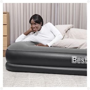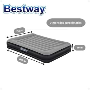 Colchão Inflável Casal Queen Premium Tritech Com Bomba Elétrica Bestway Voltagem: Bivolt Colchão Inflável Casal Queen Tritech Bestway O Colchão Inflável Casal Queen Tritech da Bestway é a escolha ideal para quem busca conforto, praticidade e durabilidade em um colchão inflável. Com tecnologia avançada e materiais de alta qualidade, este colchão oferece uma experiência de sono superior transformando sua experiência de dormir em puro luxo, seja para uso em casa, em viagens ou para acomodar convidados. Características Principais: Tecnologia Tritech tm : Desenvolvido com a exclusiva tecnologia Tritech tm , que utiliza três camadas de PVC, poliéster e vinil, o colchão oferece maior resistência, estabilidade e durabilidade, evitando deformações ao longo do tempo. Mantém a firmeza e o conforto mesmo após várias noites de uso, proporcionando suporte adequado para o corpo e o travesseiro incorporado proporciona apoio extra para sua cabeça e pescoço. Tamanho Queen: Com dimensões generosas de 203cm de comprimento, 152cm de largura e 36cm de altura, o colchão oferece espaço suficiente para acomodar confortavelmente duas pessoas. Perfeito para garantir uma boa noite de sono, seja em casa ou ao ar livre. Bomba de Ar Integrada: Equipado com uma bomba de ar elétrica embutida que infla e desinfla o colchão rapidamente em apenas alguns minutos. Simples de usar, basta conectar à tomada e ligar a bomba para preparar o colchão sem esforço. Superfície Aveludada: A superfície superior do colchão é revestida com um material aveludado, que oferece uma sensação suave ao toque e ajuda a manter a roupa de cama no lugar durante a noite. Proporciona uma experiência de sono ainda mais confortável e aconchegante. Design Compacto e Portátil: Após desinflado, o colchão pode ser facilmente dobrado e armazenado, ocupando pouco espaço. Especificações Técnicas: Dimensões: 203cm C x 152cm L x 36cm A Material: PVC Tritech tm com revestimento aveludado Capacidade de Peso: Suporta até 300 kg Bomba de Ar: Integrada, com funcionamento elétrico Tempo de Inflagem: Aproximadamente 4 minutos Peso: Aproximadamente 6,200kg desinflado Benefícios Adicionais: Durabilidade Superior: A tecnologia Tritech tm garante que o colchão mantenha sua forma e firmeza, resistindo ao uso prolongado e às variações de temperatura. Facilidade de Uso: A bomba elétrica embutida torna o processo de inflar e desinflar o colchão rápido e sem complicações. Versatilidade: Ideal para uso em casa, em viagens, em acampamentos ou para receber visitas inesperadas com conforto. O Colchão Inflável Casal Queen Tritech da Bestway combina praticidade, conforto e durabilidade em um só produto. Seja para uso ocasional ou frequente, ele oferece uma solução confortável e confiável para suas noites de sono, onde quer que você esteja. Conteúdo da embalagem: 1 Colchão Inflável Casal e Kit de reparo. 1. Qual é a capacidade de peso do Colchão Inflável Casal Queen Tritech O colchão suporta até 300 kg, garantindo conforto e segurança para duas pessoas. 2. O colchão vem com uma bomba de ar sim, o colchão possui uma bomba de ar elétrica integrada, que facilita o processo de inflar e desinflar. 3. Posso usar o colchão em ambientes externos sim, o colchão é versátil e pode ser utilizado tanto em ambientes internos quanto externos, como em acampamentos. No entanto, é importante protegê-lo de superfícies pontiagudas e condições climáticas extremas. 4. O colchão perde ar durante a noite graças à tecnologia Tritech tm , o colchão é projetado para minimizar a perda de ar. No entanto, uma ligeira perda pode ocorrer, especialmente com variações de temperatura, mas isso é normal para colchões infláveis.