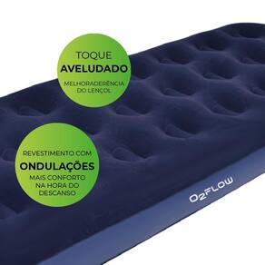 Colchão Inflável Solteiro Multiuso Até 100 kgs O2Flow O Colchão Inflável Solteiro O2Flow é perfeito para servir como cama extra para receber suas visitas, acomodar as crianças para brincarem, assistir seus filmes favoritos em qualquer lugar da casa, utilizar em acampamentos ou onde você precisar PVC resistente em toda a sua estrutura, conta com um revestimento aveludado na parte superior que torna sua superfície extremamente confortável e facilita a aderência do lençol ou dispensa sua utilização. Além disso, suas ondulações proporcionam o ajuste do corpo, oferecendo um descanso agradável e adequado para diversas situações. Possui válvula de enchimento e esvaziamento com sistema de fechamento seguro que evita o vazamento de ar. Principais Características: - Revestimento Aveludado com Ondulações - Compacto para Guardar - Sistema de fechamento que evita Vazamento de Ar - Fácil de Encher e Esvaziar - Cor: Predominante Azul - Capacidade: 1 pessoa - Ondulações proporcionam o ajuste do corpo - Válvula de enchimento e esvaziamento Especificações Técnicas: - Conteúdo da Embalagem: 1 Colchão Inflável Solteiro + Fita de reparo - Dimensões do Produto: LxCxH 22,0 x 73,0 x 191 cm Aprox. - Composição/Material: PVC - Peso Suportado: 100 kg Aprox. - : 90 Dias Contra Defeito de Fabricação de pelo Fabricante - Referência do Fabricante: 21565 - Código EAN: 7899403215653 - Marca: O2Flow Imagens meramente ilustrativas, cores e estampas podem variar de acordo com o lote do fabricante. Marca: Não Informado