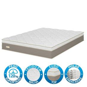 Características: Peso suportado 120kg Molas ensacadas Densidade D-26 Revestimento tampo malhas Revestimento lateral poliéster Possui EPS One face -não permite virar o colchão- Possui pilow: Euro top Selo inmetro: 007069/2024 OCP: 0166