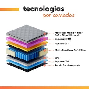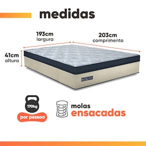 REVESTIMENTO INTERNO: Composto por camadas de Matelassê em malha com espuma Hiper Soft, espuma HR 50 e espuma D33, que proporcionam conforto e sustentação ideais. O sistema de molas ensacadas individualmente garante estabilidade e independência de movimentos, que faz com que o colchão suporte até 170 kg por pessoa.
