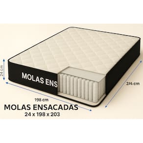 - Proteções: Antiácaro - Antialérgico - Antifungo - Antimofo;- Acabamento: Bordado em Matelassê;- Matéria prima: Poliéster/Bordado;- Mola: Ensacada;- Peso máximo recomendado: até 100kg (por pessoa);- Garantia: 3 meses;- Dimensões do produto (altura x largura x comprimento): 24x198x203cm;