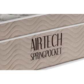 Performance, bordado em matelassê e placa EPS. Seu tampo é em malha de alta qualidade e lateral em Camurça, apresentando um toque refinado ao colchão. Possui a tecnologia No Turn, que dispensa a necessidade de virar o colchão. O Airtech Spring Pockt recebe tratamento antialérgico e antiácaro, ajudando a reduzir os problemas respiratórios.