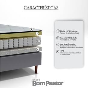 Estrutura em molas ensacadas individualmente e borda lateral em espuma de alto resiliência.