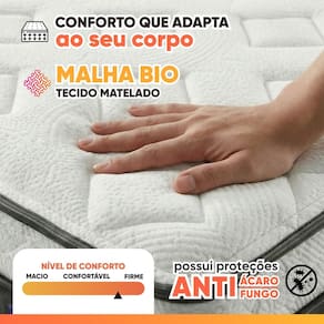 COLCHÃO CONTÉM: ANTI MOFO: prolonga a vida útil do colchão, preservando a integridade e a qualidade do tecido / ANTI ALÉRGICO: proporciona noites de sono mais tranquilas, saudáveis e livres de irritações / ANTI ÁCARO: mantém o ambiente de descanso mais puro, higiênico e agradável