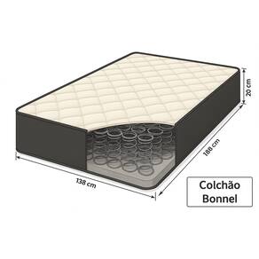 - Proteções: Antiácaro - Antialérgico - Antifungo - Antimofo;- Acabamento: Bordado em Matelassê;- Matéria prima: Poliéster/Bordado;- Mola: Bonnel;- Peso máximo recomendado: até 100kg (por pessoa);- Garantia: 3 meses;- Dimensões do produto (altura x largura x comprimento): 20x138x188cm;