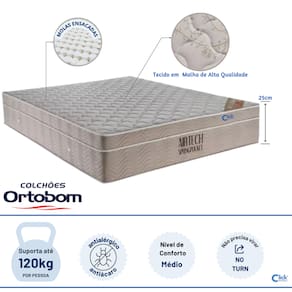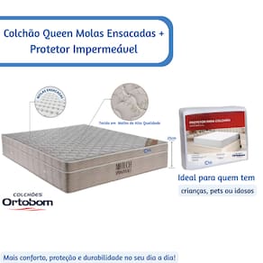 Kit Colchão Ortobom Airtech Queen + Protetor de Colchão Impermeável O Kit é composto por colchão Airtech de Molas Ensacadas e Capa protetora para colchão Impermeável . Colchão Ortobom Airtech – 158x198x25 cm Tipo de molas: ensacadas individualmente Camada de espuma D26. Placa de EPS que contribui para estabilidade. Revestimento em tecido jacquard com viscose. Sistema No Turn (giro sem necessidade de virar). Tratamentos: antiácaro e antialérgico. Suporte de peso: até 120 kg por pessoa Protetor de Colchão Impermeável Ortobom – 158x198 Material: malha 100% poliéster com aplicação de PU. Impermeável e respirável. Tratamentos: antiácaro e antifungo. Fixação com elástico em formato de lençol. Observações Importantes Antes da compra, confira as dimensões do produto e verifique se ele passa por portas, corredores e elevadores do local de entrega.