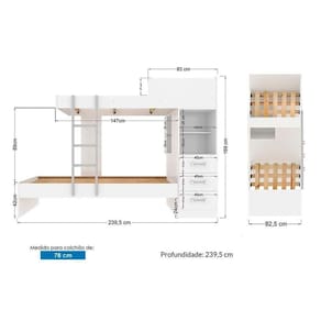 Dimensões(Cm): Comprimento(Profundidade): 239,5cm x Largura: 92,5cm x Altura: 169cm Material de Estrutura - MDF/MDP Tipo de Pintura - Ultravioleta - Texturizada Tipo de Acabamento da Pintura - Semi Brilho Tamanho da Cama - Solteiro Diferenciais das Camas - Proteção Lateral - Escada Metálica - Escada Frontal Quantidade de Gavetas - 3 Quantidade de Prateleiras - 1 Prateleira Quantidade de Nichos - 1 Nicho Montagem do Produto - Desmontável - c/ Opções de Montagem Certificação de Qualidade - Qualidade Aprovada Garantia - 3 meses