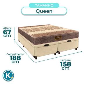 Modelo: Elite Marca: Nature Tamanho: Queen Tecido: Veludo Largura: 158cm Comprimento: 198cm Altura: 35cm Altura dos Pés: 7cm Material dos Pés: Madeira Suporte de Peso: 150Kg Peso: 40Kg Garantia: 3 Meses
