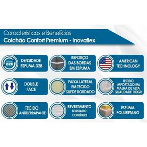 Tipo de Colchão - Anatômico Vantagens Extras de Colchão - Ecologicamente Correto - Tecnologia Americana Tecido com Tratamento do Colchão - AntiÁcaro e AntiFungo Bordado do Revestimento do Colchão - Contínuo Forração Revestimento do Colchão - Malha de Alta Qualidade Tecido de Revestimento da Faixa Lateral do Colchão - Suede Modo de Utilização do Colchão - Double Side
